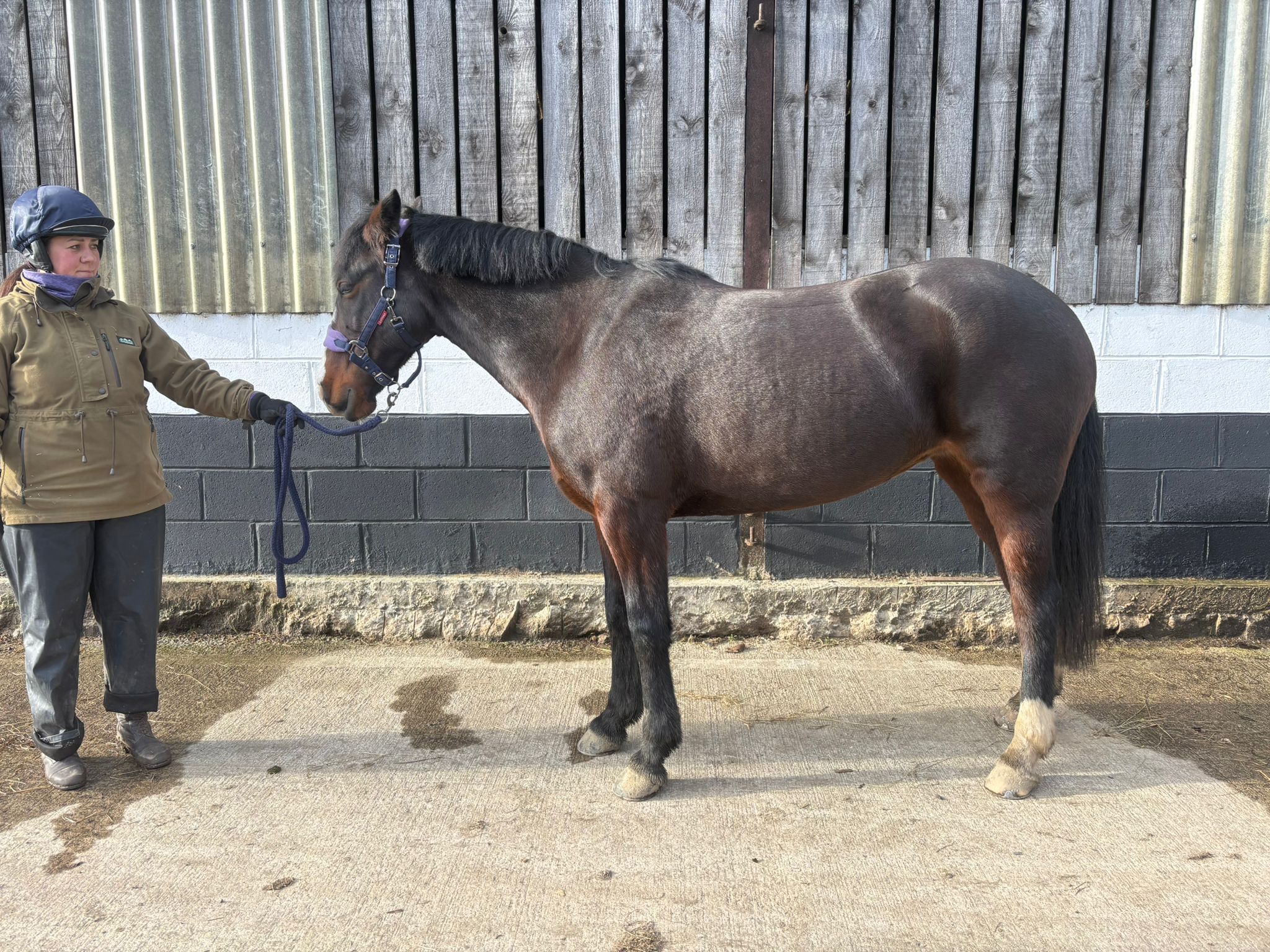Molly is currently stabled overnight and turned out in a mixed herd; however, will happily live out 24/7 with shelter. As a hunter type, Molly is good at taking additional grass! Meaning she doesn't need restrictive management. A great addition to other horses of similar management.